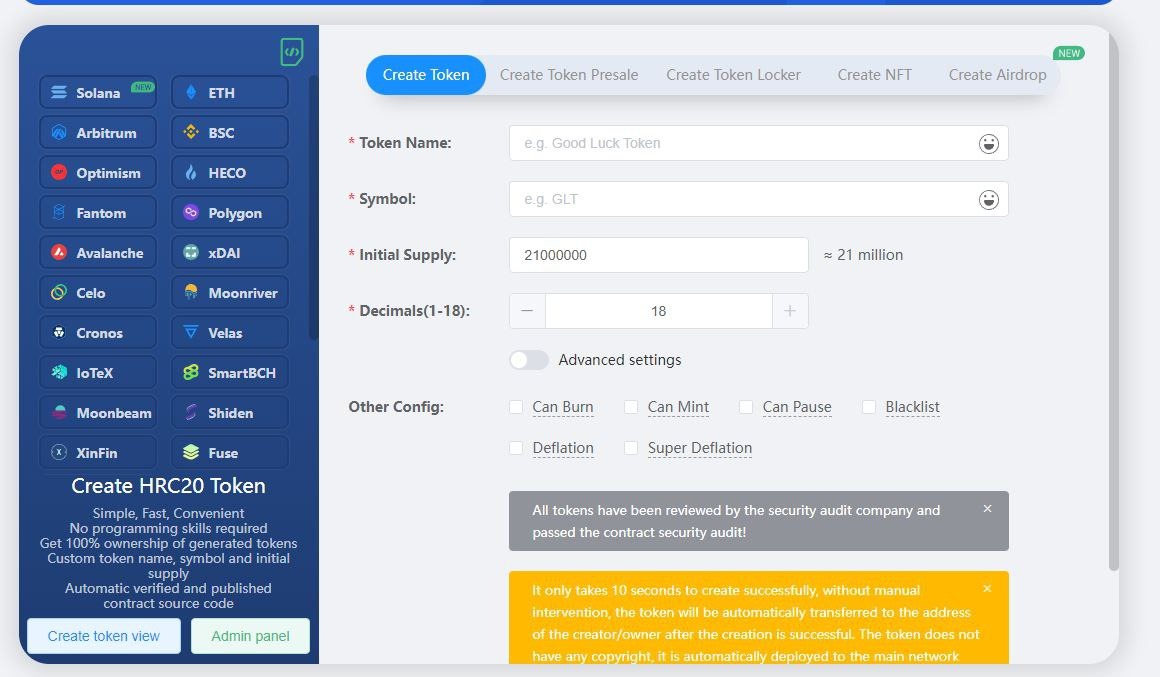 Обязательно ставьте Advanced Settings и впишите ваш кошелек (если не вписан). В Other Config ничего не ставьте - иначе потом агрегаторы будут писать, что ваш токен - Scam. Initial Supply можете поставить какой угодный, это количество выпущенных монет