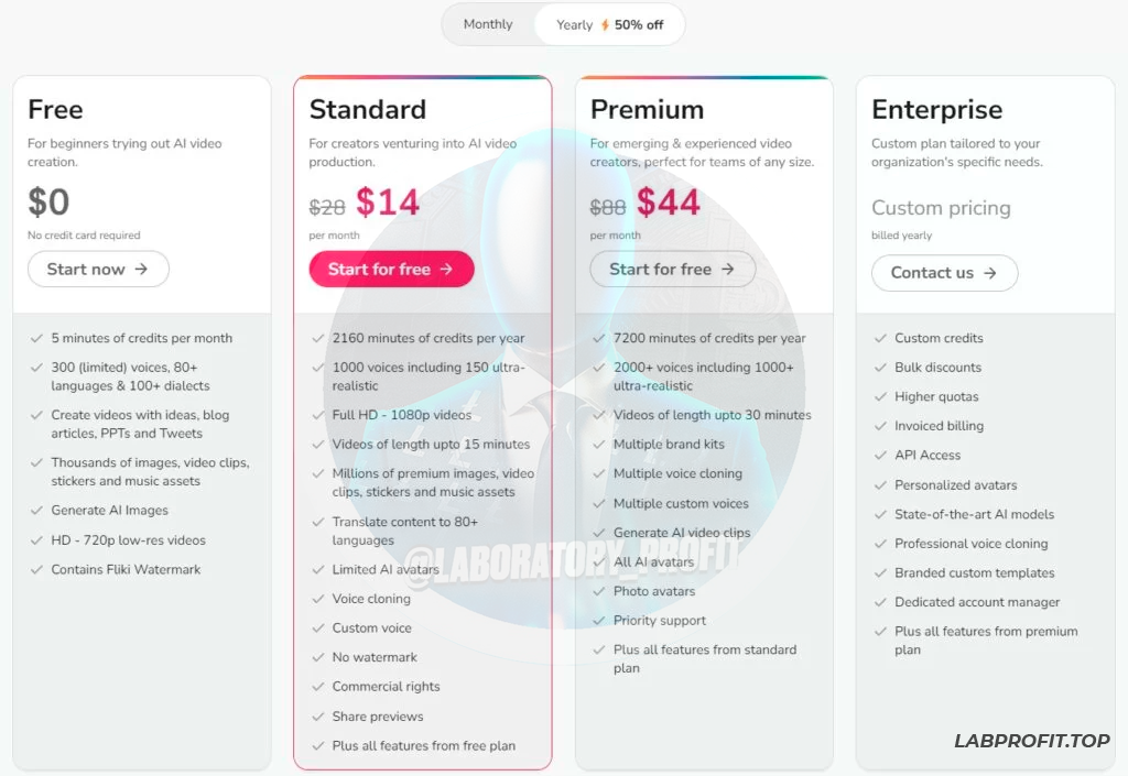 Для пользователей доступен бесплатный тариф с ограничением на пять минут видео в месяц и водяным знаком. Однако, платная версия начинается от $28 в месяц, а при оплате на год вперед цена снижается до $14.
