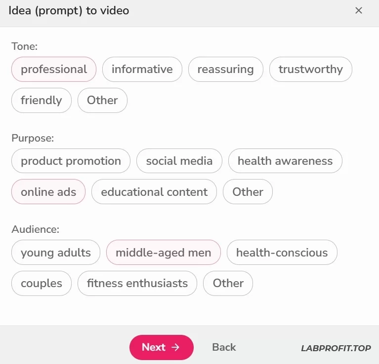 В InVideo предусмотрен интуитивно понятный процесс генерации роликов. Пользователь задает параметры, включая язык, стиль видео, аудиторию и платформу для публикации.