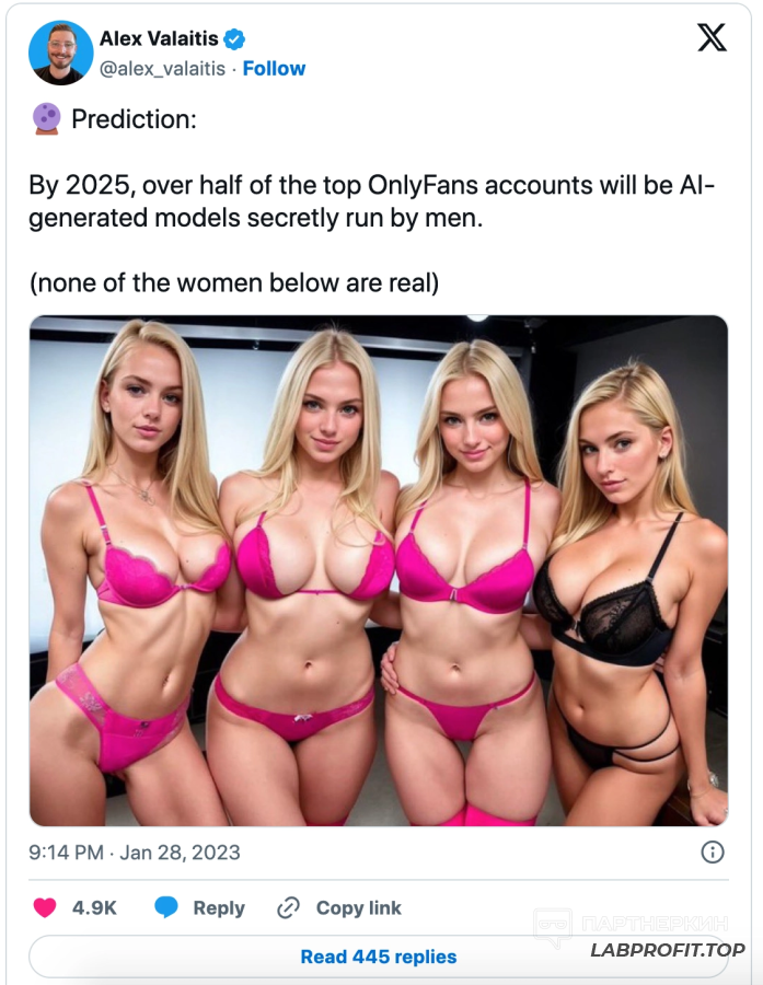 К 2025 году более половины самых успешных аккаунтов OnlyFans могут оказаться под управлением мужчин, создающих изображения женщин с помощью искусственного интеллекта (ИИ). Такую смелую теорию высказал аналитик Алекс Валайтис.
