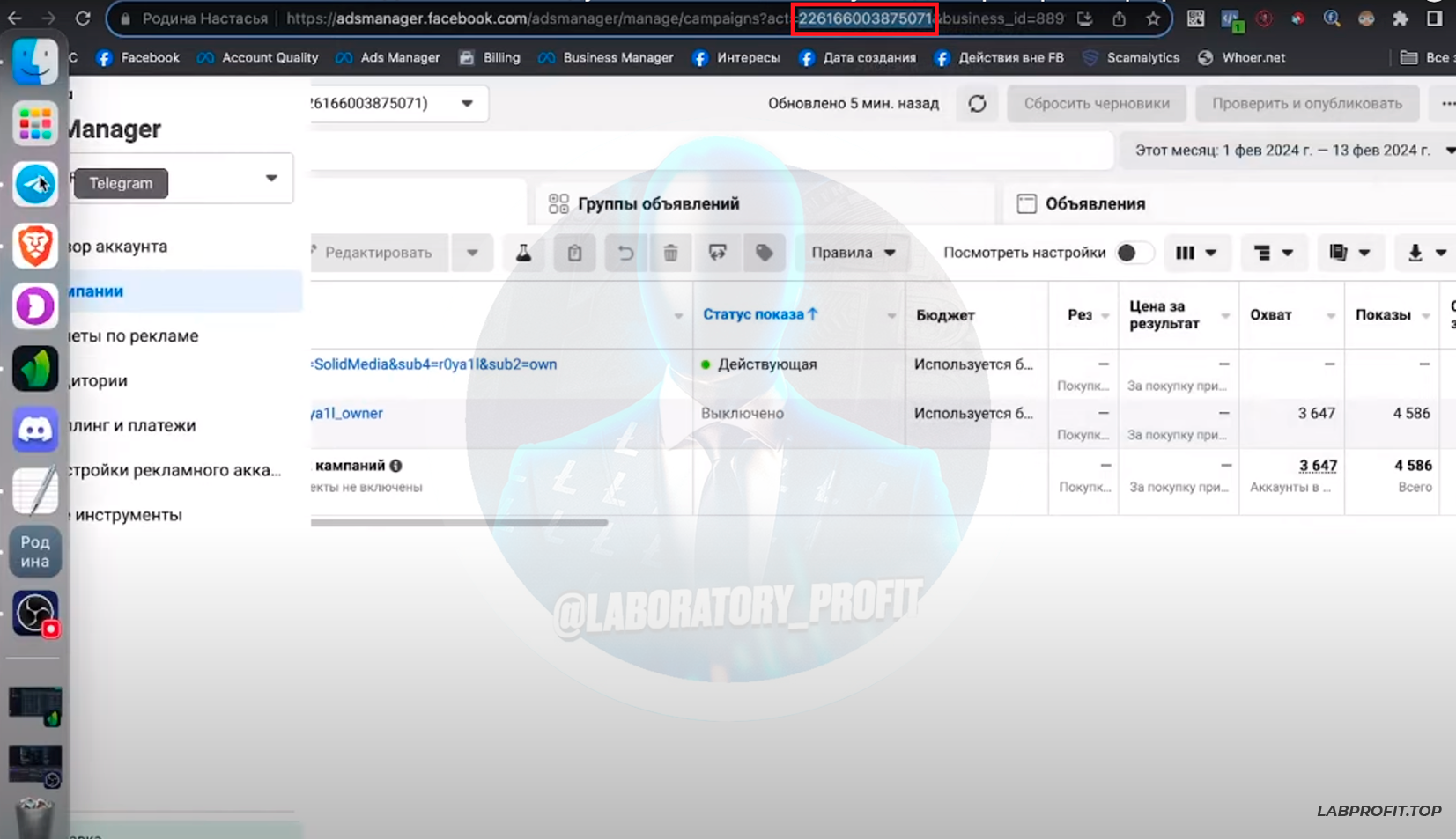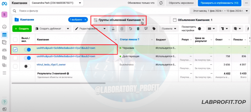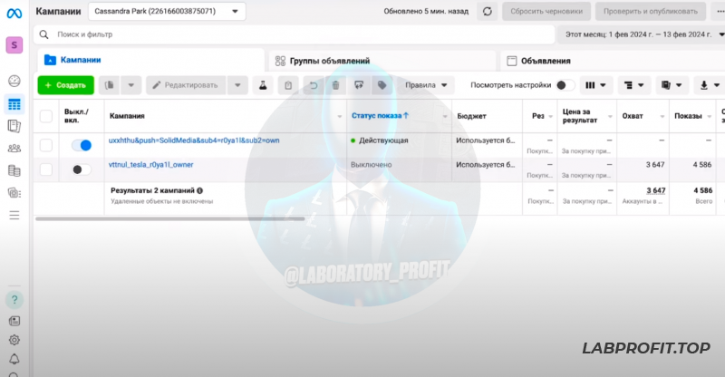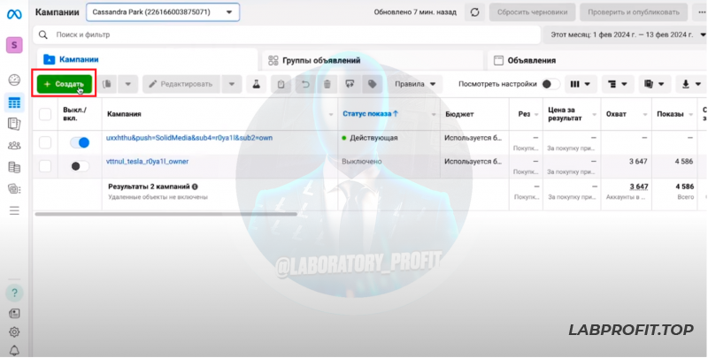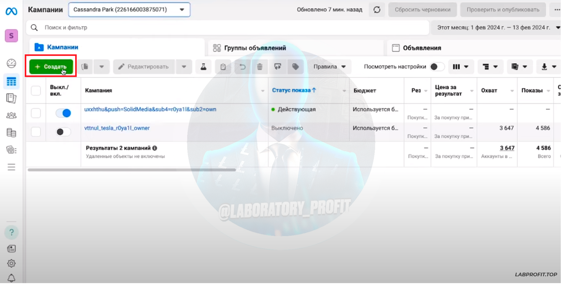 После этого, в разделе "Кампании" в AdsManager у нас появится наша кампания и мы можем отслеживать ее статистику.