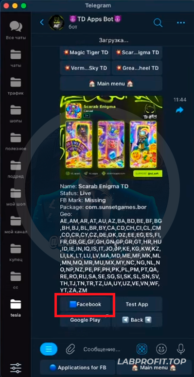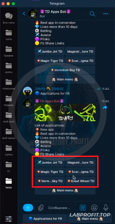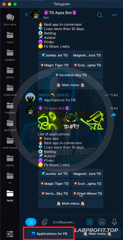 Переходим в бота, нажинаем кнопку "Application for FB" и выбираем понравившуюся прилку. Сейчас лучше использовать новые прилки, потому что они живут дольше обычных.