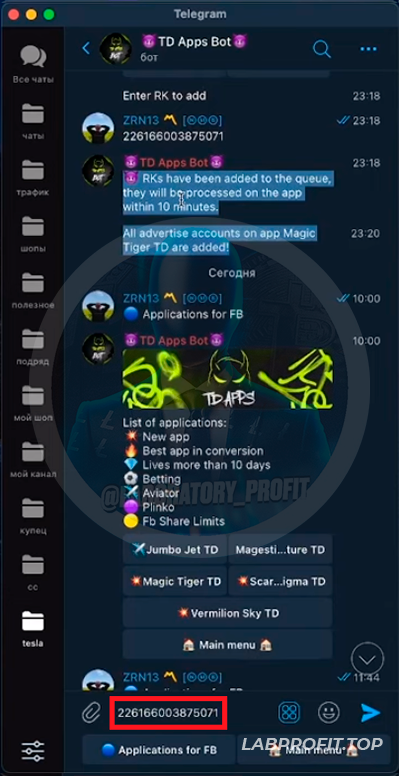 Теперь нам нужно скопировать ID аккаунта и отправить ее боту, в котором вы выбрали прилку для залива. В моем случае - это TD Apps Bot.