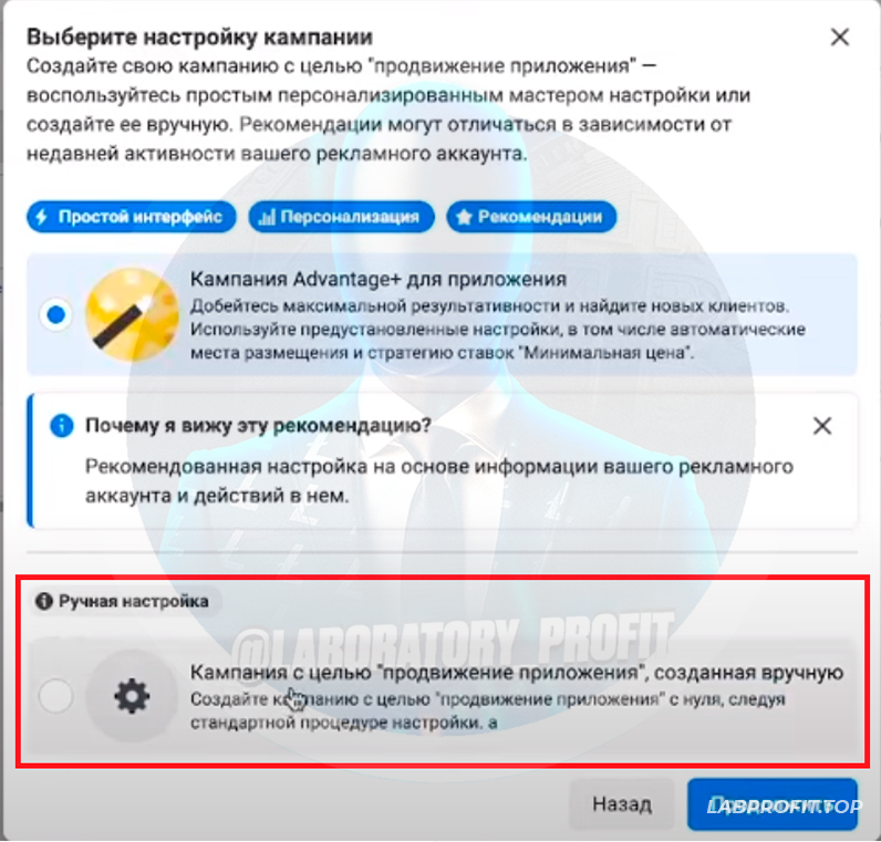 На следующей странице всегда выбираем пункт "Ручная настройка", потому что автоматическая настройка кампании от Facebook оставляют желать лучшего.