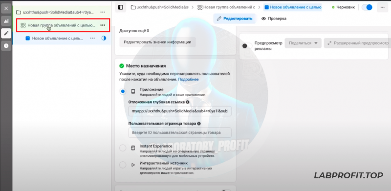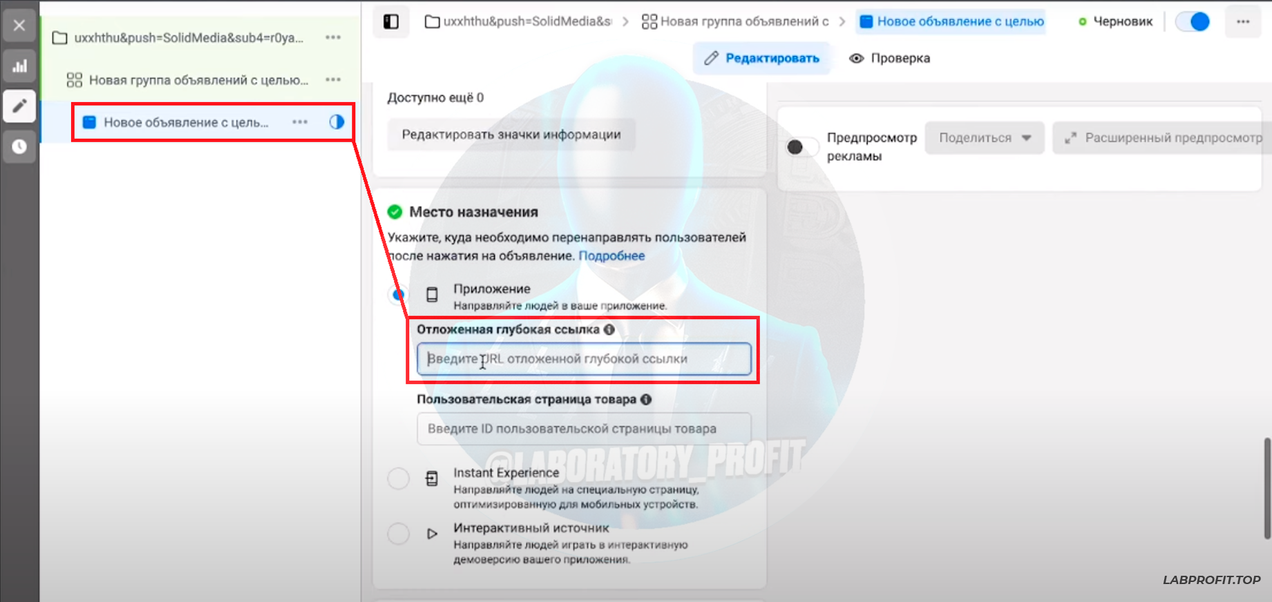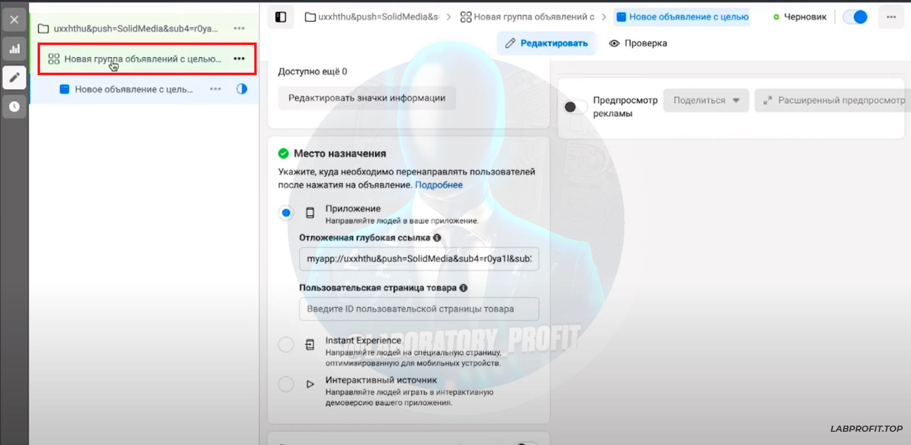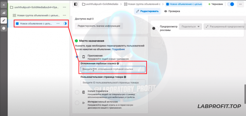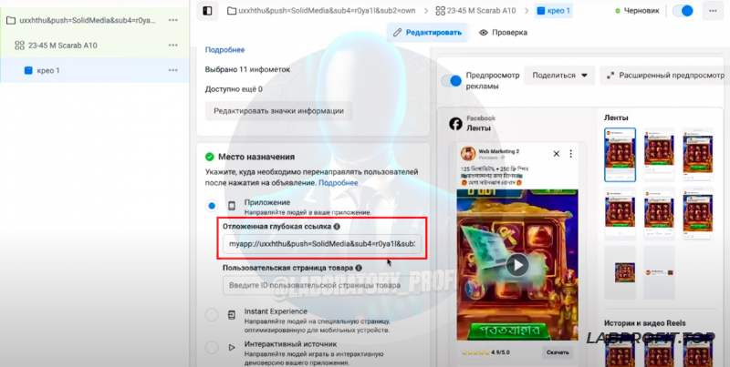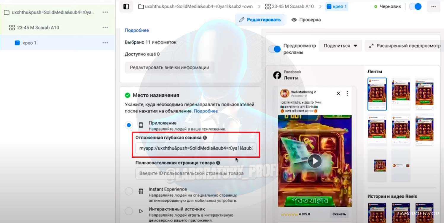 Также, не забываем вставить наш диплинк нашей партнерской программы в пункте "Место назначения". Проверяйте, чтобы в диплинке не было никаких ошибок, иначе они могут не привеститрафика и вы потеряете деньги.
