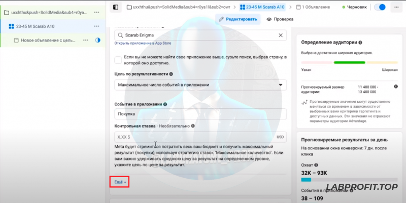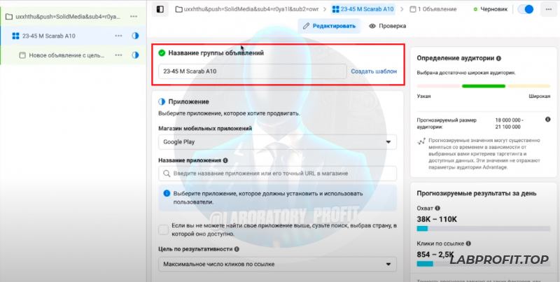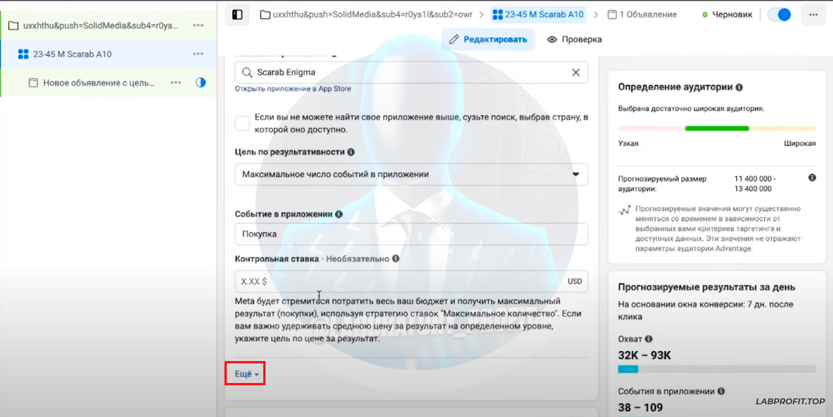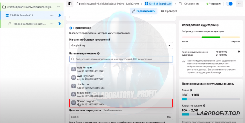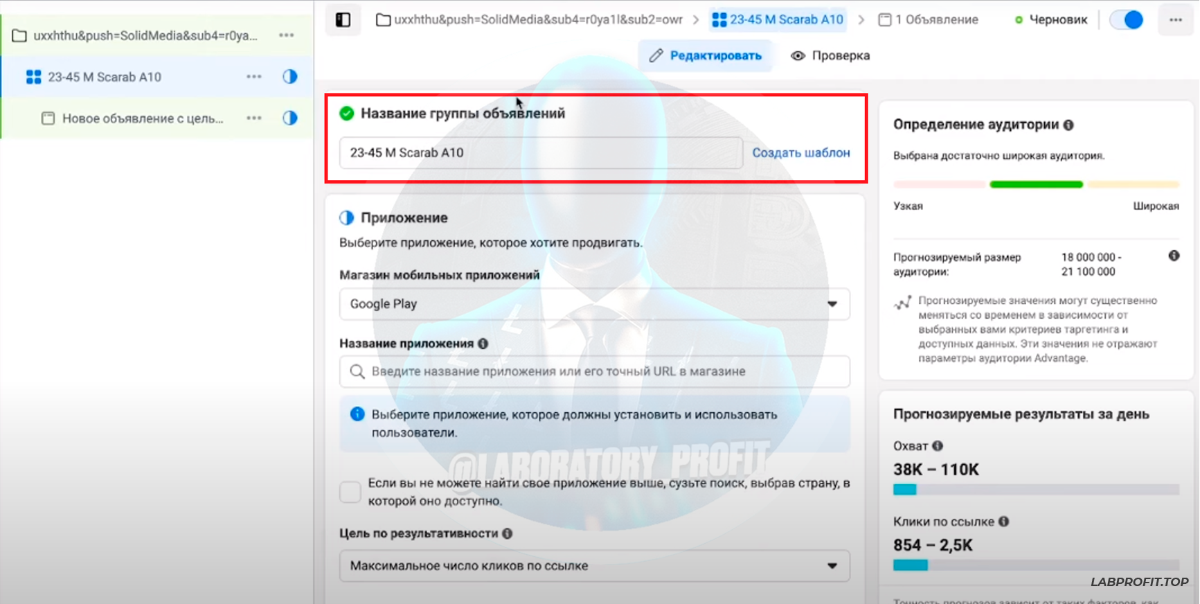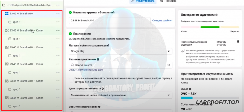 Теперь, мы сможем мониторить, на какую прилку мы запускаемся, какой таргет выбираем. Данный таргет я выбрал, чтобы максимально сузить аудиторию и привлекать более платежеспособных людей.