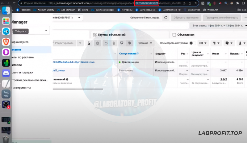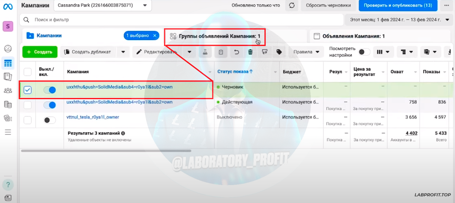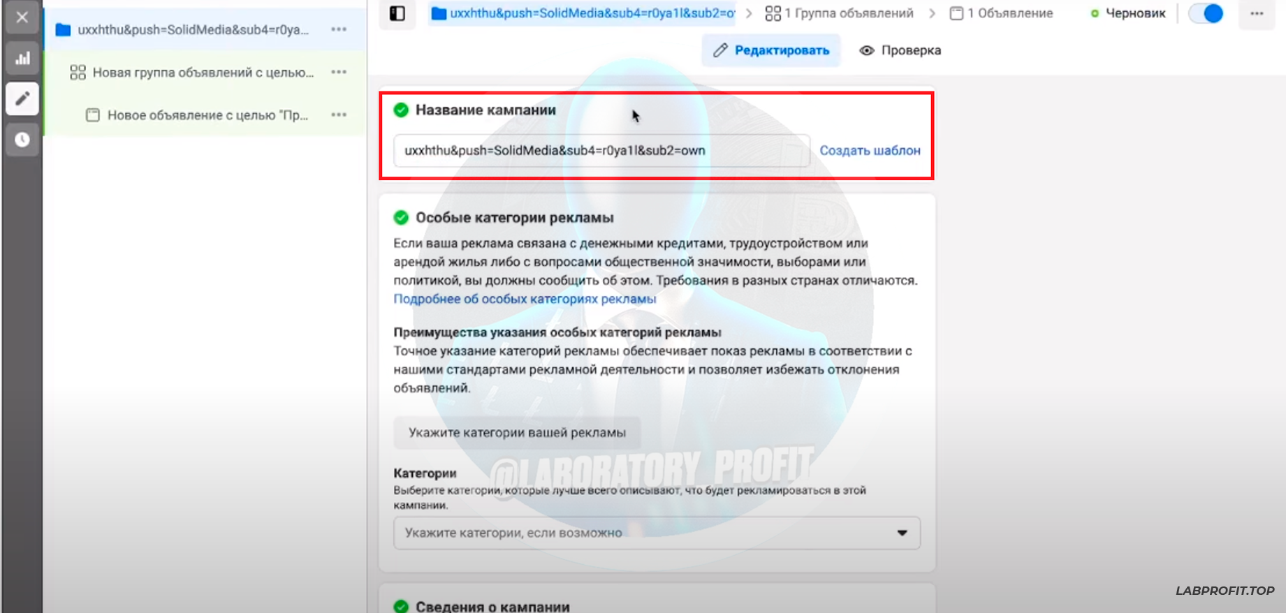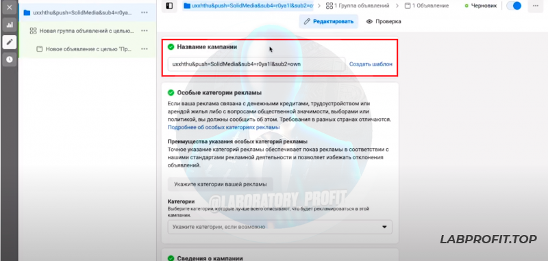 Теперь, нам нужно скопировать нейминг, который мы получаем от менеджера партнерской программы и вставить его в "Название кампании" в AdsManager.