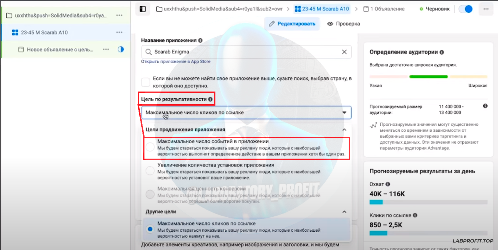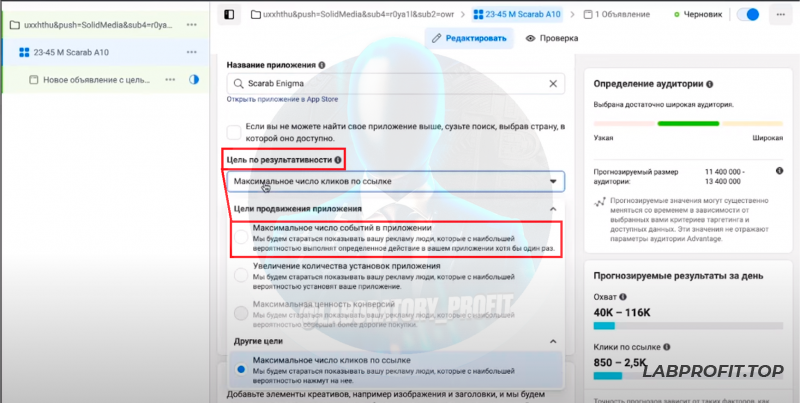 В пункте "Цель по результативности", выбираем "Максимальное число событий в приложении".
