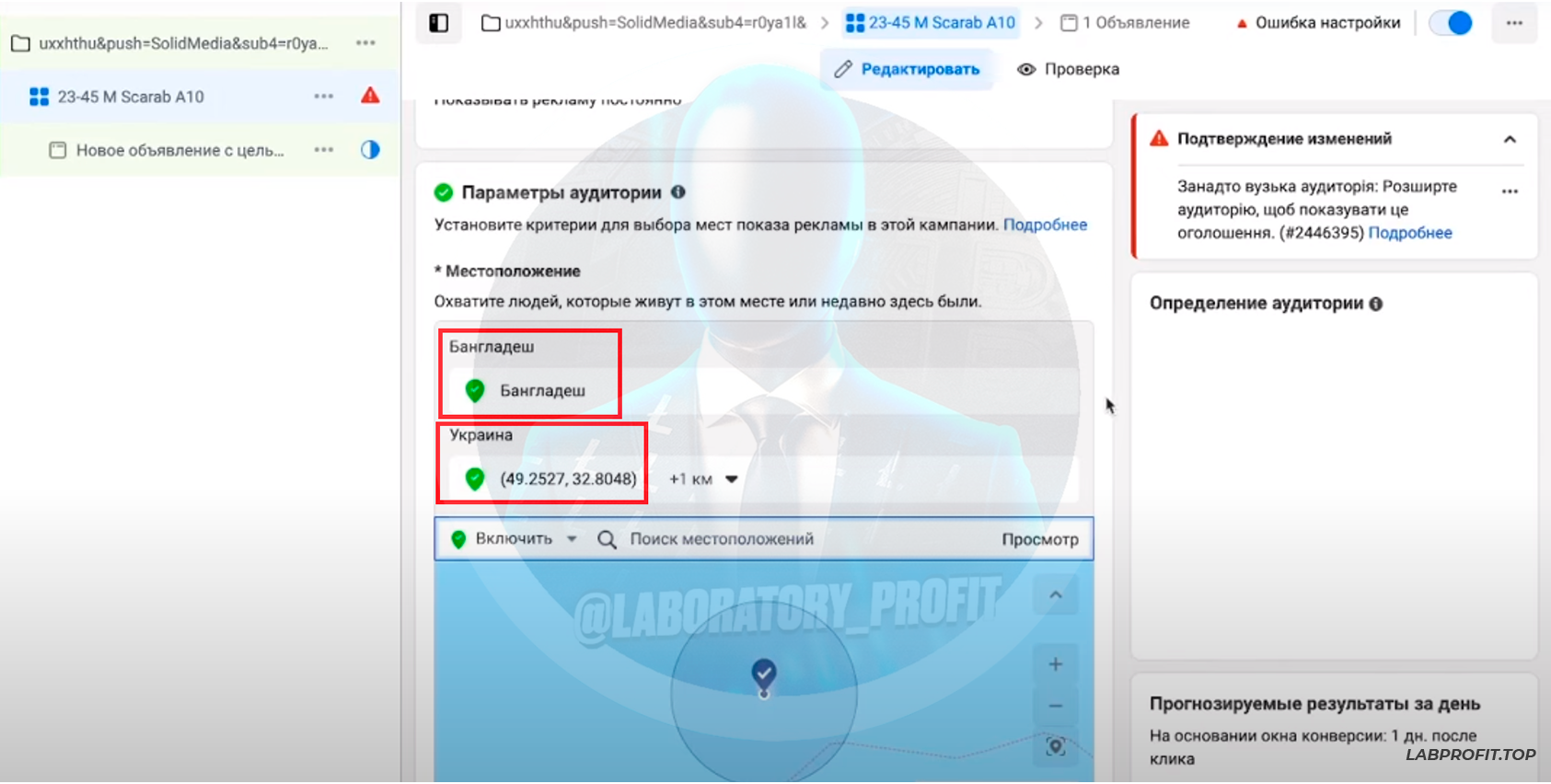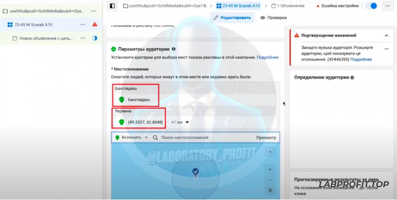 В пункте "Параметры аудитории" ставим ГЕО страны из который вы льете на ГЕО Бангладеш, потому что именно туда будет идти наша реклама.