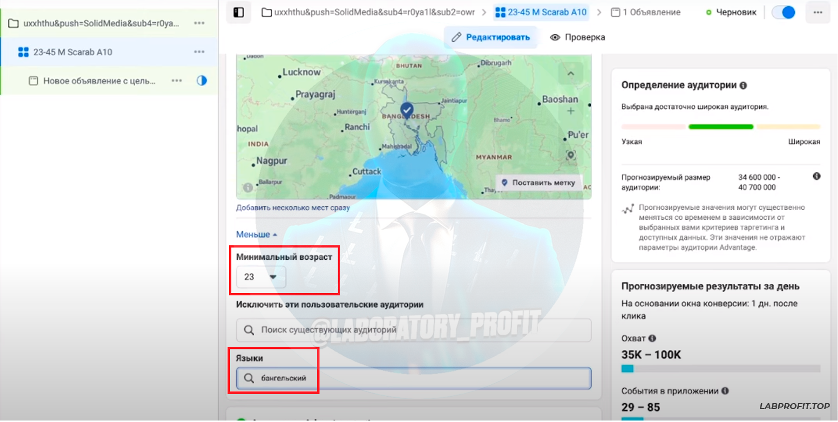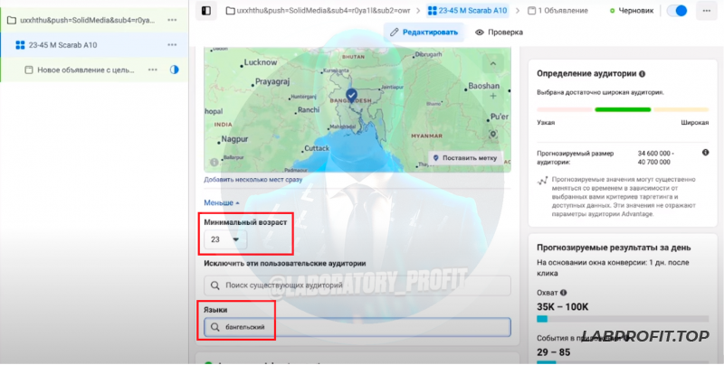 Далее, ставим минимальный возраст - 23 года, в языках указываем, те что есть в стране, на которую мы будем лить рекламу. В Бангладеше, например, бенгальский язык.