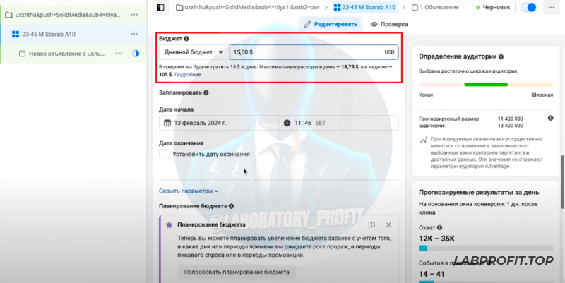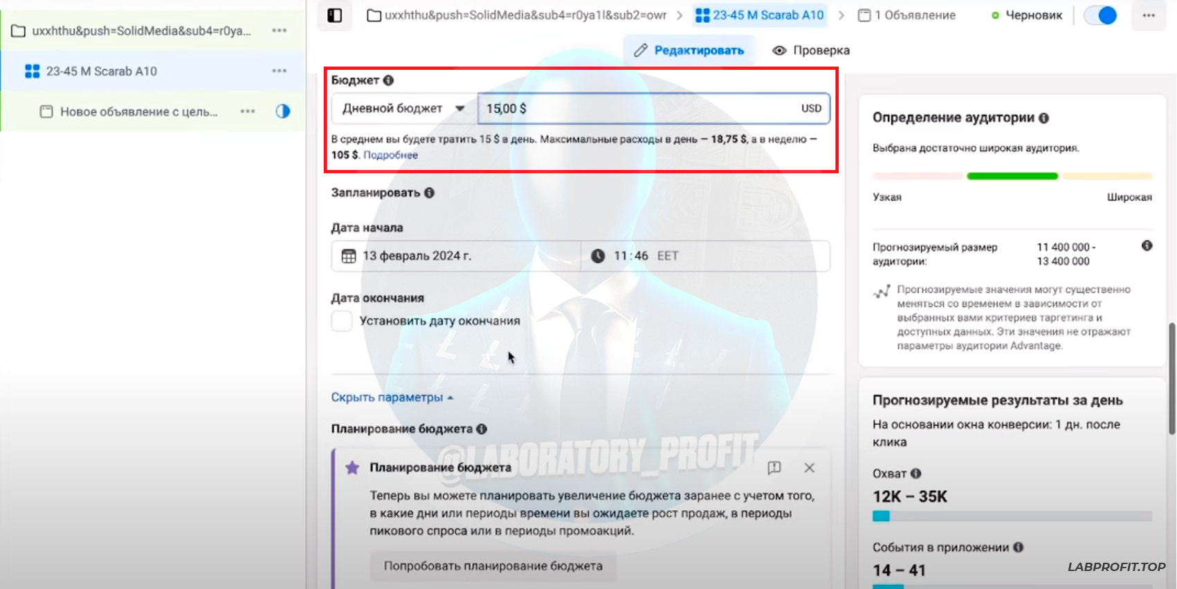 В дневном бюджете указывайте сумму, исходя из ваших финансовых возможностей. Лично я ставлю 15$.