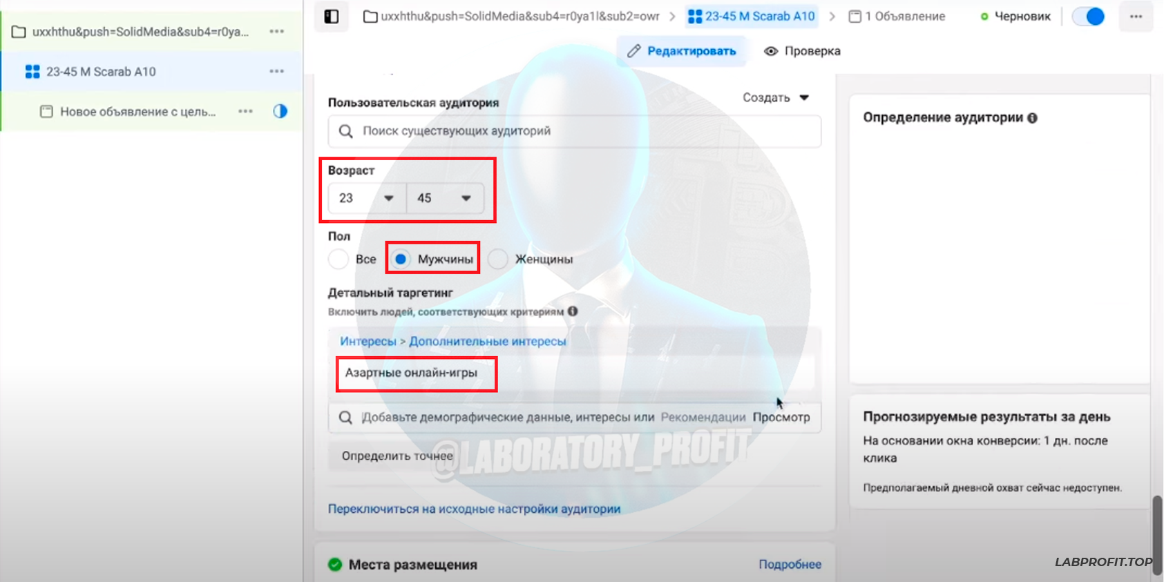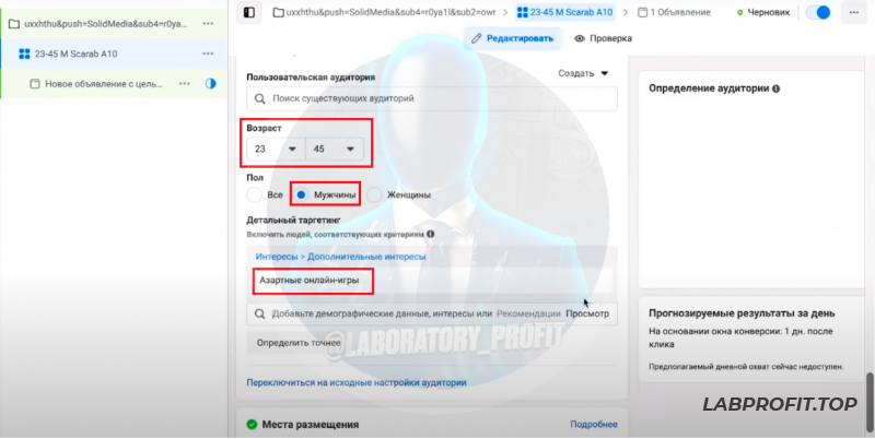 В пункте "Аудитория Advantage +"нам нужно сузить круг аудитории, чтобы было как можно больше платежеспособных людей.