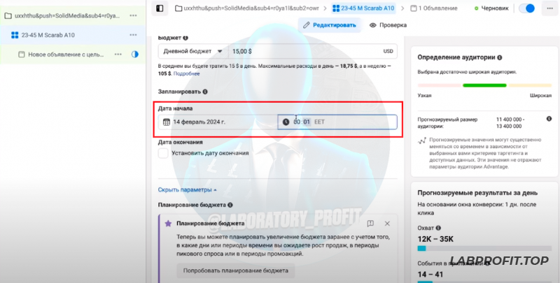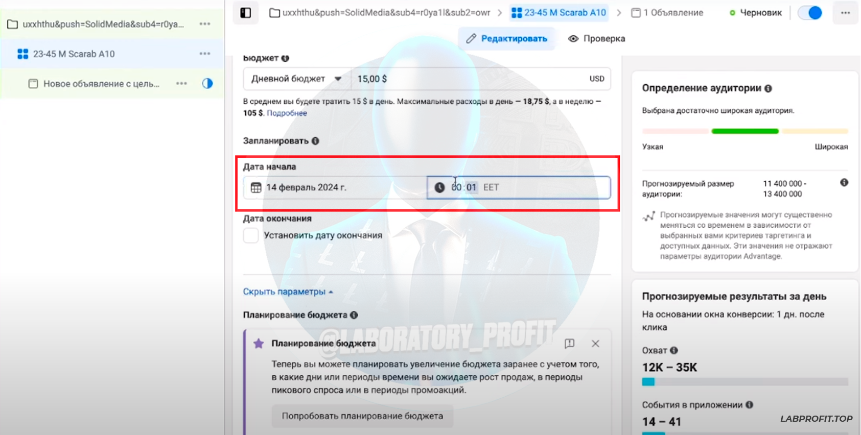 В пункте "Дата начала" желательно ставить время 00:01 для того, чтобы отливаться целые сутки. В это же время начинается аукцион Facebook и мы можем достаточно удачно пролезть с нашей кампанией.