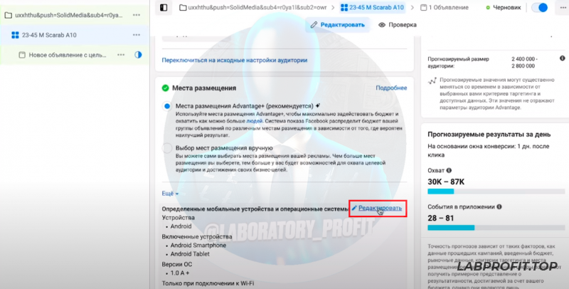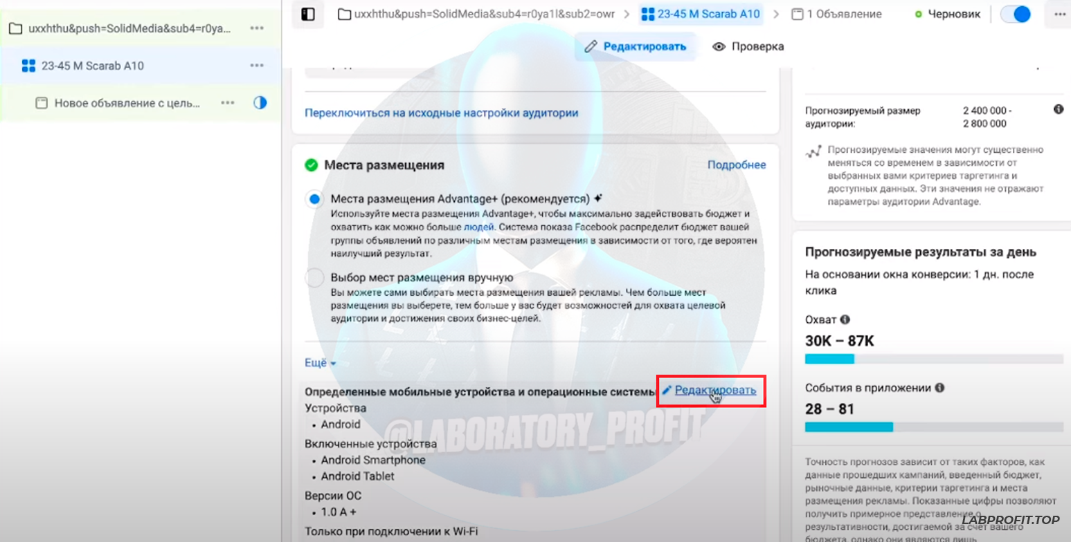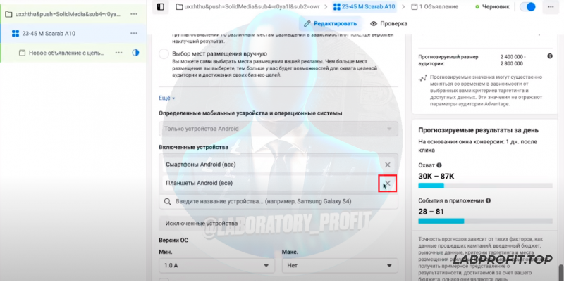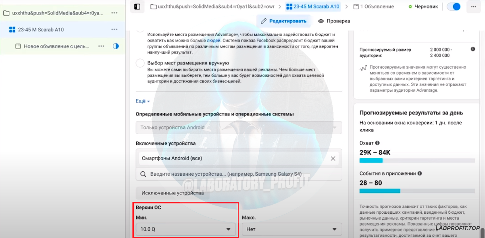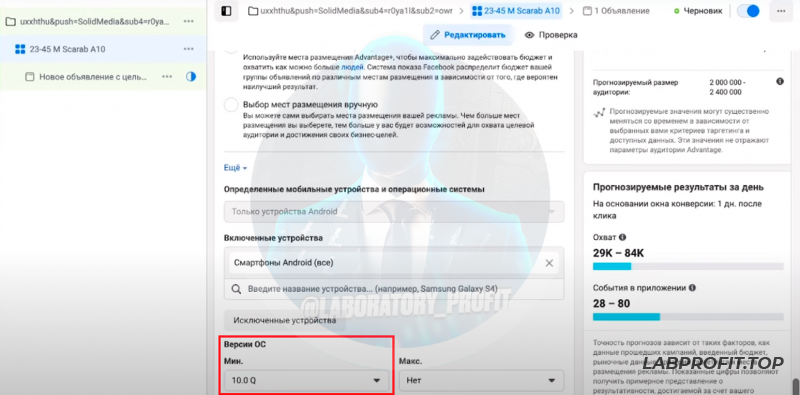 В мобильных устройствах обязательно убираем планшеты и ставим минимальную версию андроида - 10.0 Q, чтобы нам не попадалась неплатежеспособная аудитория.
