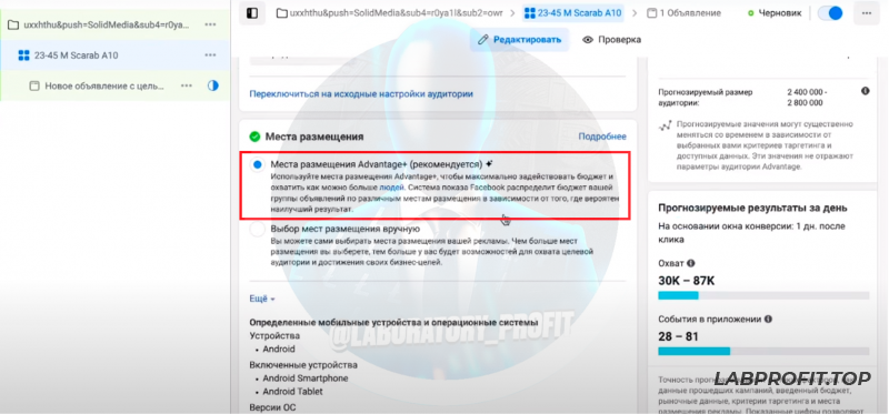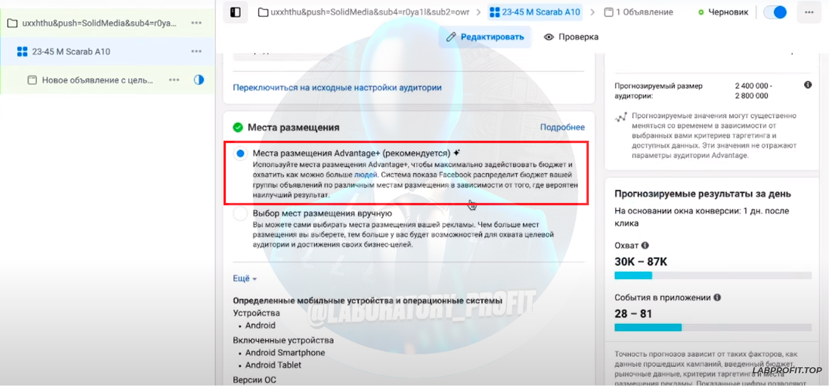 В следующем пункте указываем "Места размещения Advantage+". Как показывает практика, автоматическое размещение от Facebook будет обходиться дешевле, так как он анализирует, где лучше заходит ваша рекламная кампания и не использует способы, которые дают маленький трафик.