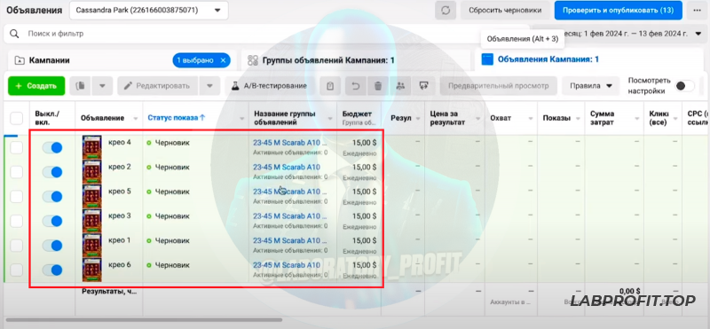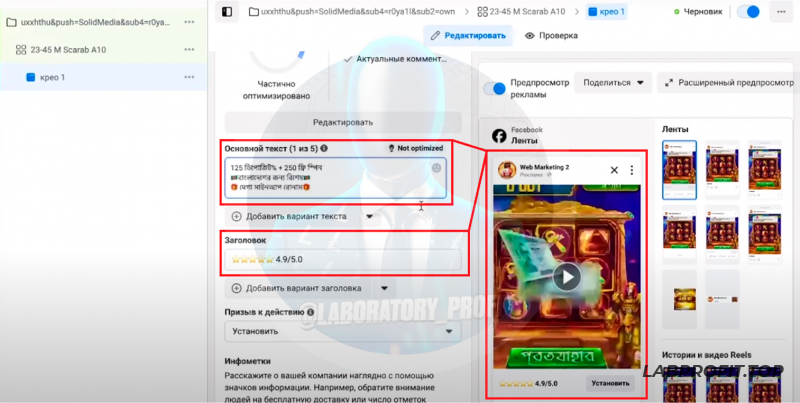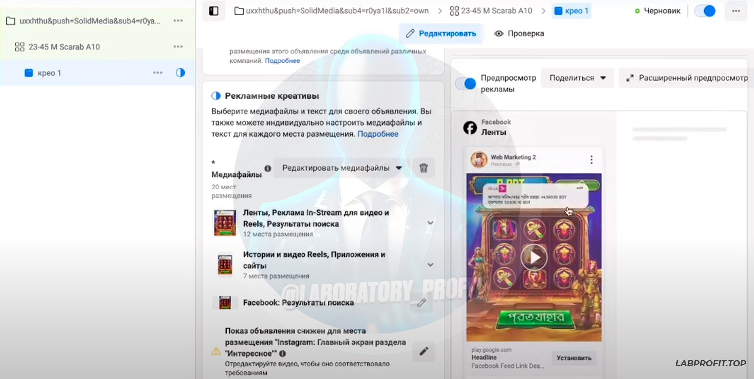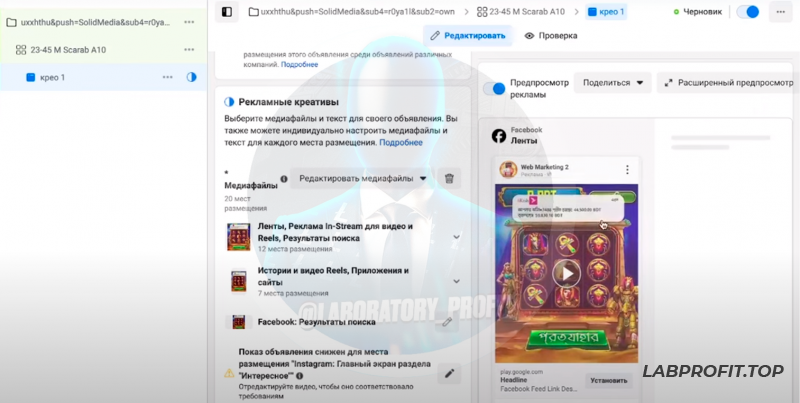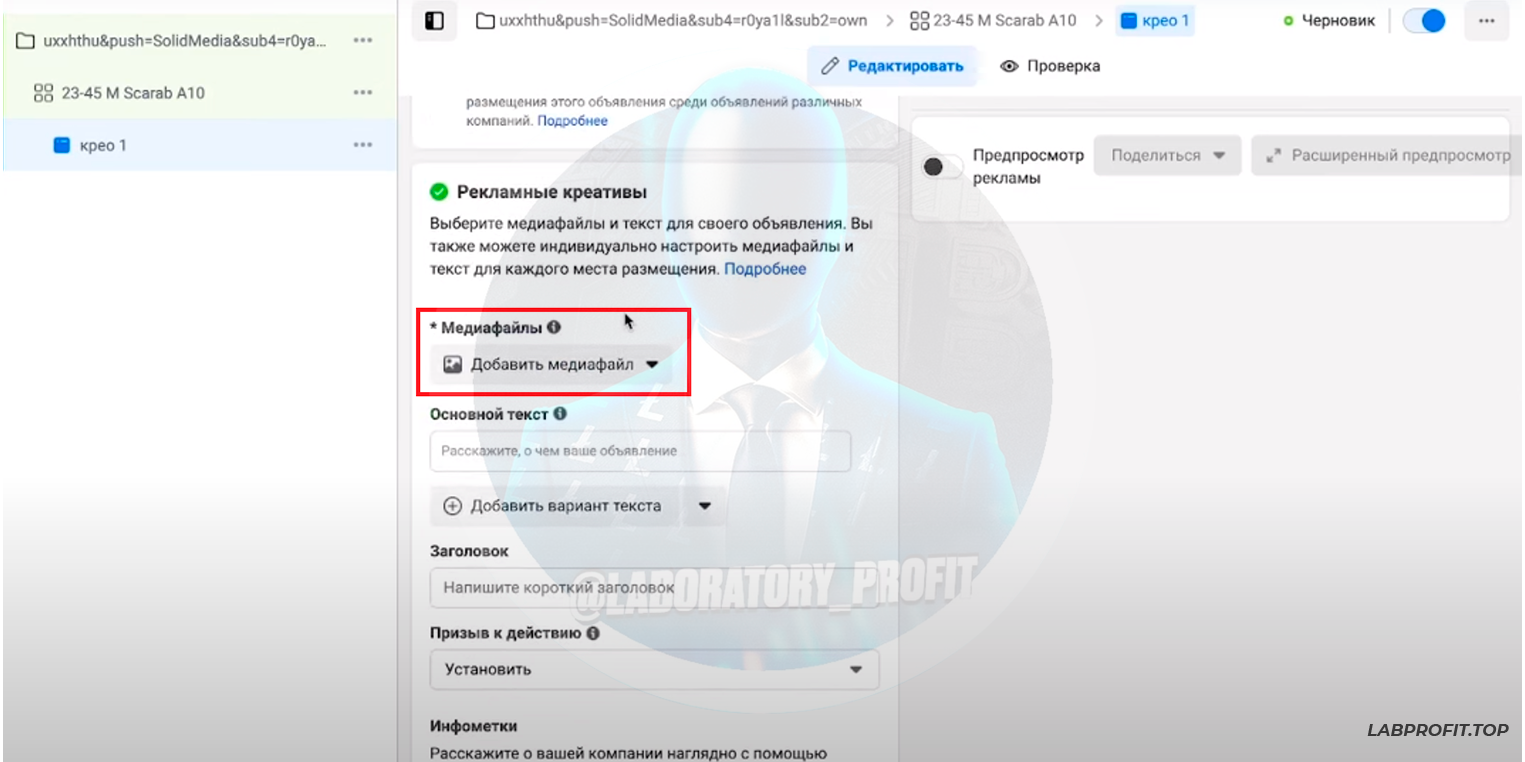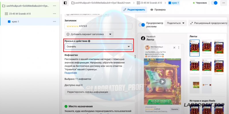 Теперь, нужно в каждый креатив подгрузить новые и видоизменить описания и заголовки.