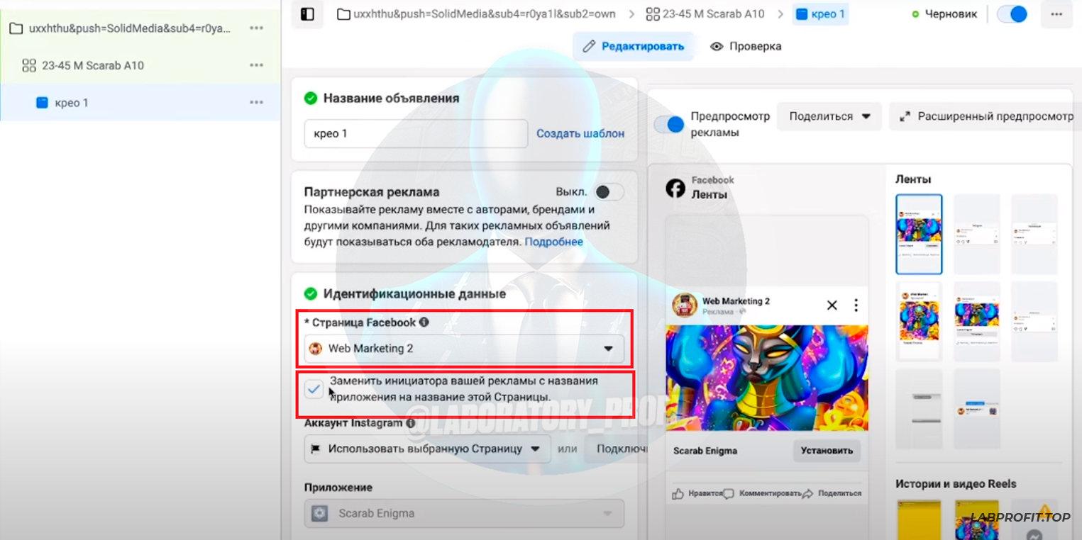 Также, аккаунт Facebook, должен быть полностью заполнен под то, что вы заливаете. И, чтобы не словить бан прилки, нажимаем на пункт "Заменить инициатора вашей рекламы с названия приложения на название этой страницы".