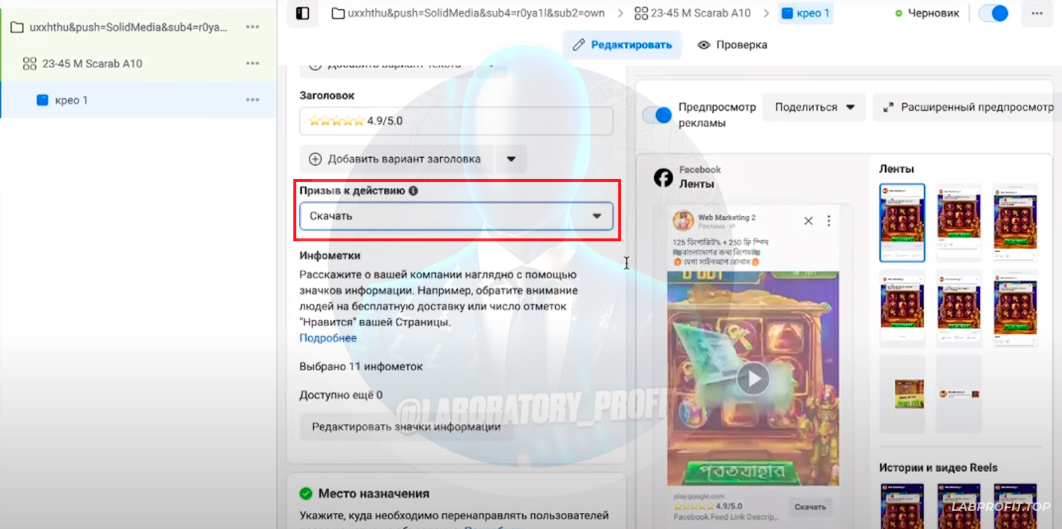 В пункте "Призыв к действию" ставим "Скачать", так как он чуть больше конвертит.