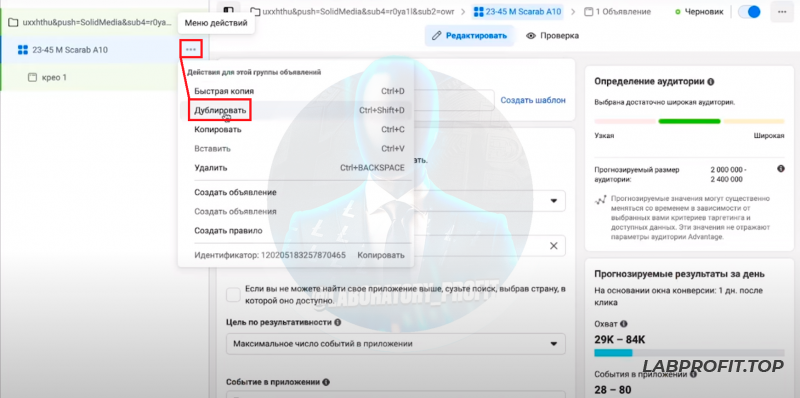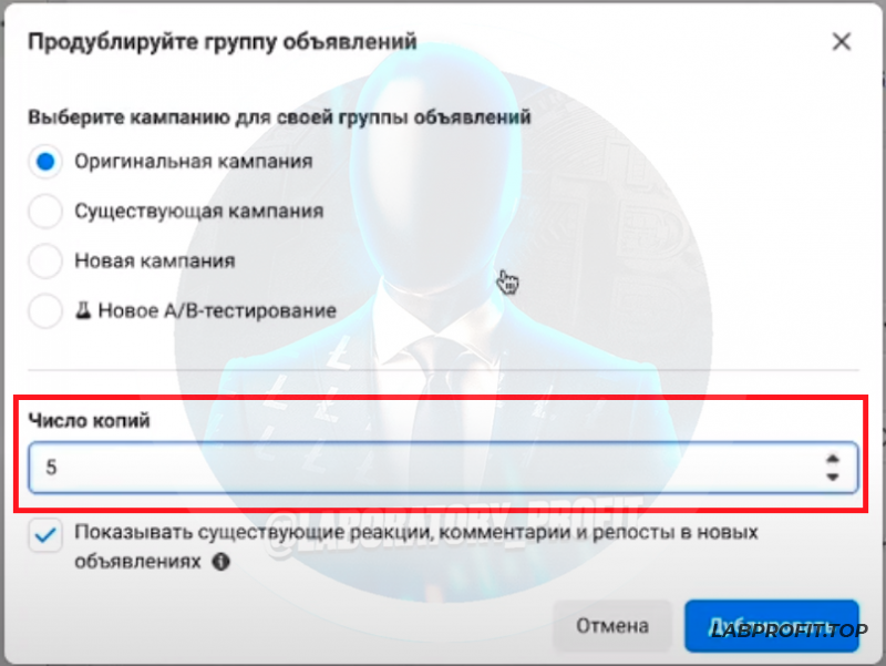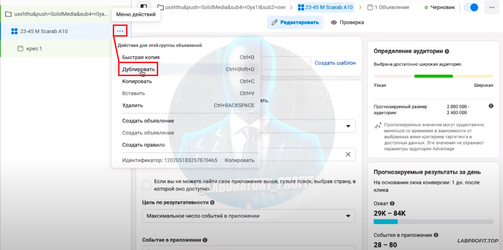 Для того, чтобы оптимизировать показ объявлений для Facebook, мы можем сделать дубль кампании.