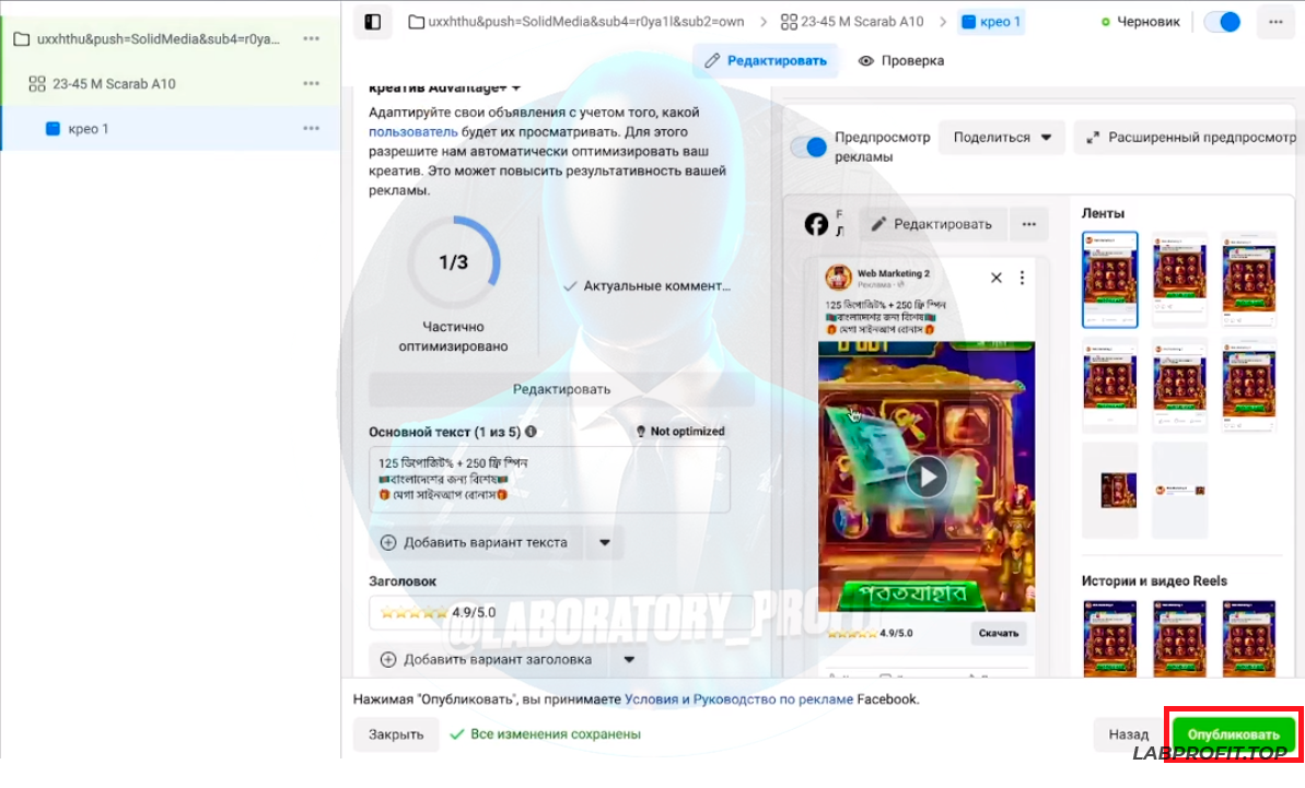 После выполнения всех вышеуказанных действий у нас есть готовая рекламная кампания, которую мы уже можем запустить, нажав кнопку "Опубликовать".