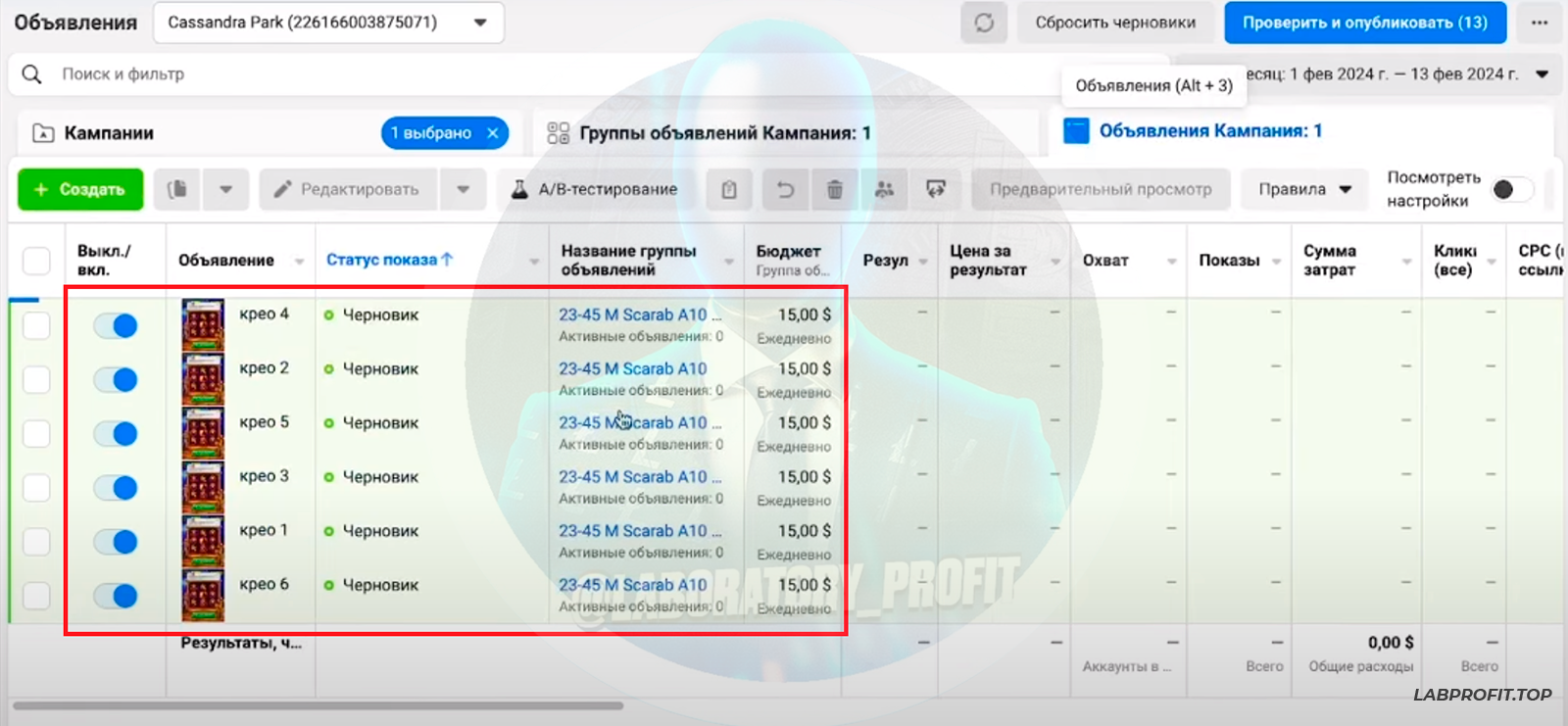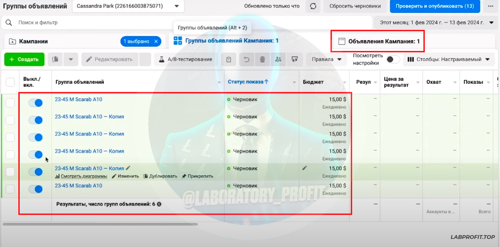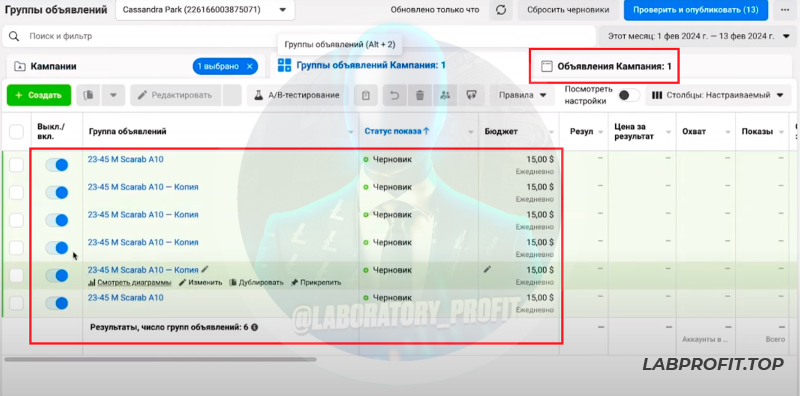 Таким образом, у нас получается 1 кампания, 6 объявлений и в каждом объявлении по 1 креативу.