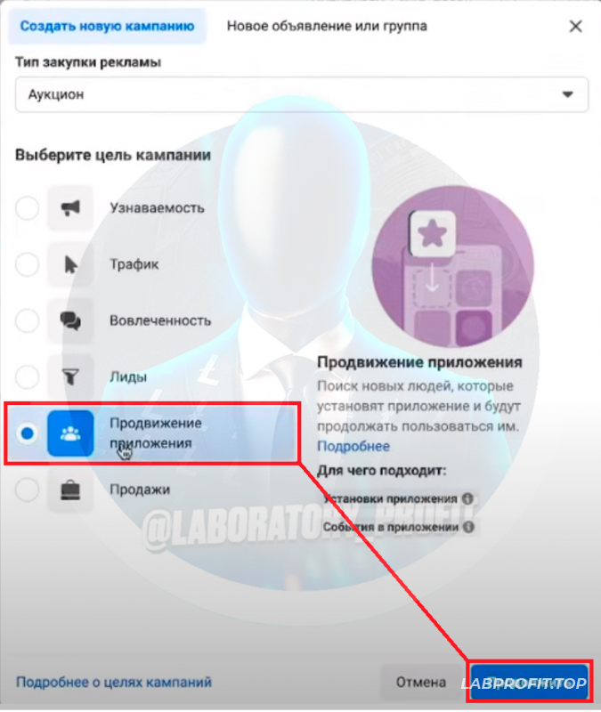 Нажинаем кнопку "Создать" на главной странице AdsManager, далее выбираем пункт "Продвижение приложения".