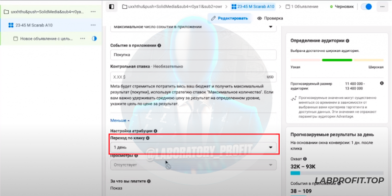 Немного ниже нажинаем на кнопку "Еще" и в пункте "Переход по клику" выбираем "1 день", потому что, в среднем, прилка живет не больше одного дня.