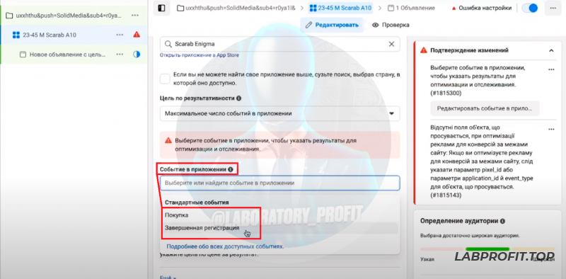 Также, если заливать на депозиты, то в пункте "Событие в приложении" нужно указать "Покупка", если же залив идет на регистрации, то ставим "Завершенная регистрация".