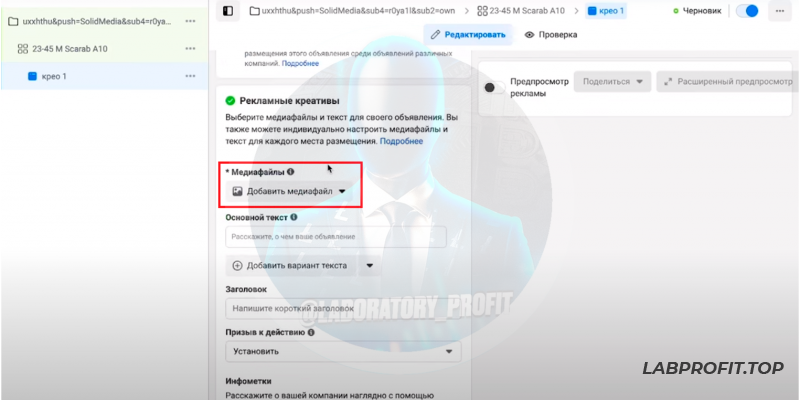 В блоке "Рекламные креативы" нам нужно выгрузить заготовленные крео под ваше приложение.