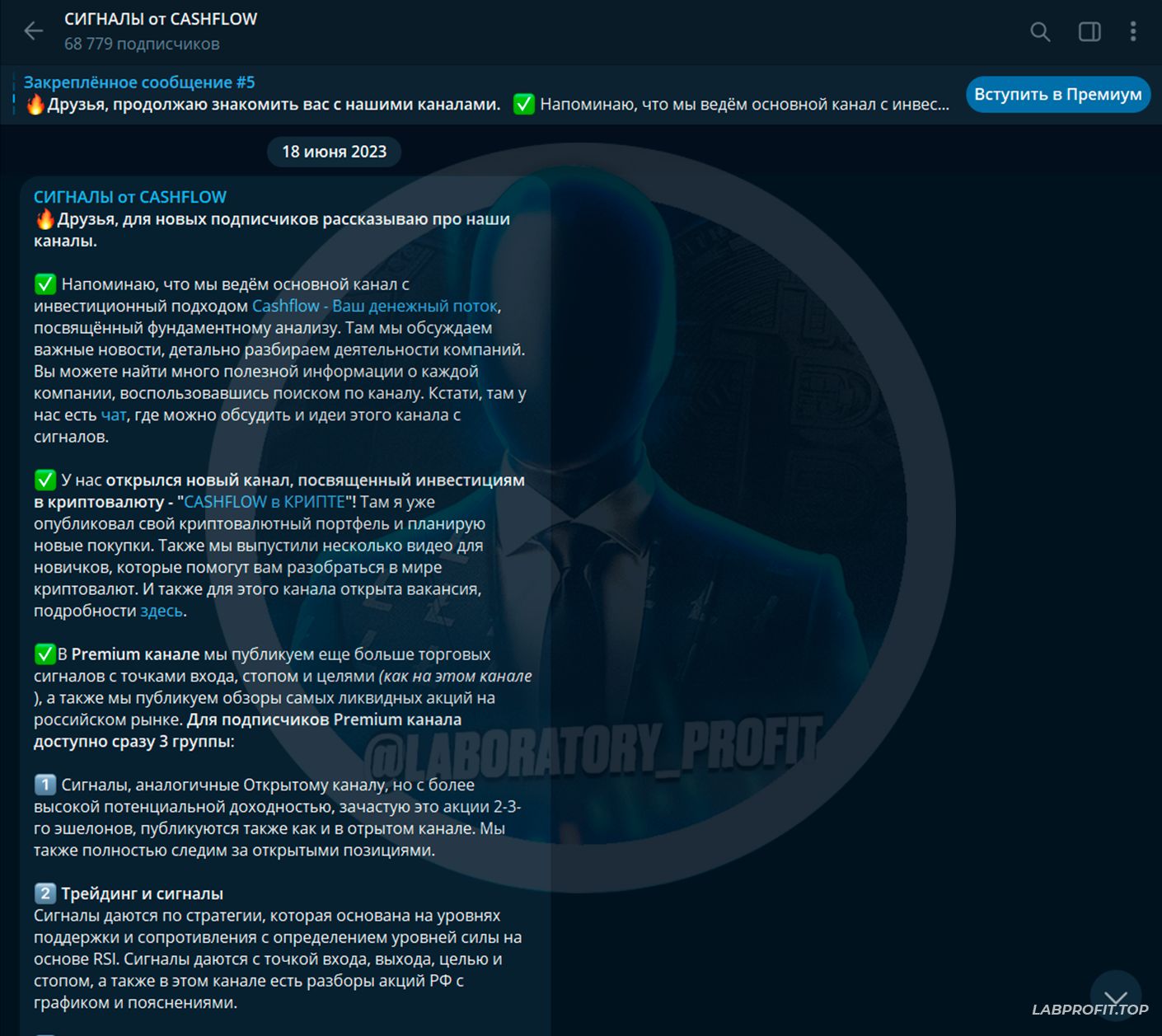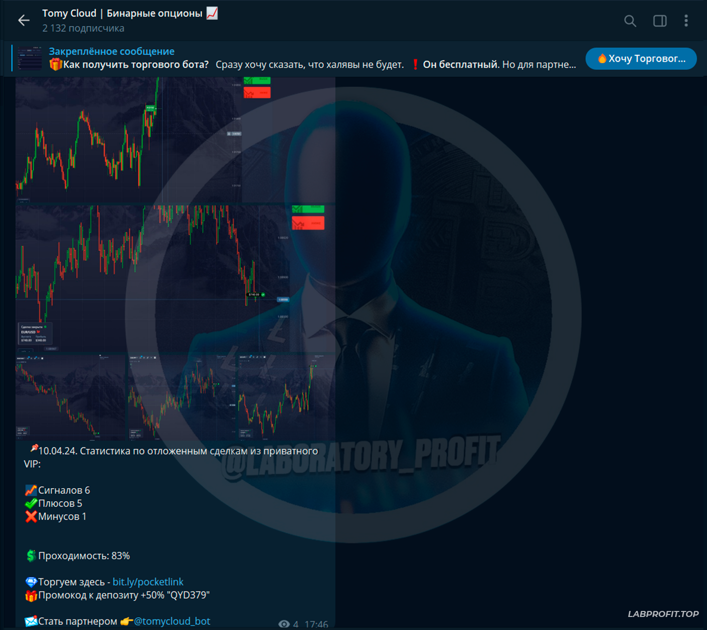 Количество постов в канале не ограничено, и важно поддерживать активность публикаций, чтобы привлекать внимание аудитории. Каждый пост должен содержать сигнал - информацию о позиции (криптовалюта/акция/драгметалл), прогнозе (рост или падение) и периоде ставки. Каждому сигналу прикрепляется партнерская ссылка на оффер, что позволяет монетизировать трафик через CPA или RevShare (чаще второе).